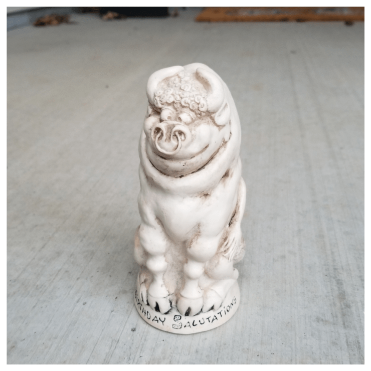 A few days later, I came home from work to a small statue sitting on my front porch. Erin saw it first and said, “What in the world is that?!” As soon as I walked around the corner and saw what he was referring to, I started laughing. It was the most ridiculous little figurine my grandpa kept on his desk in his office, and it used to absolutely terrify me. Check it out:
