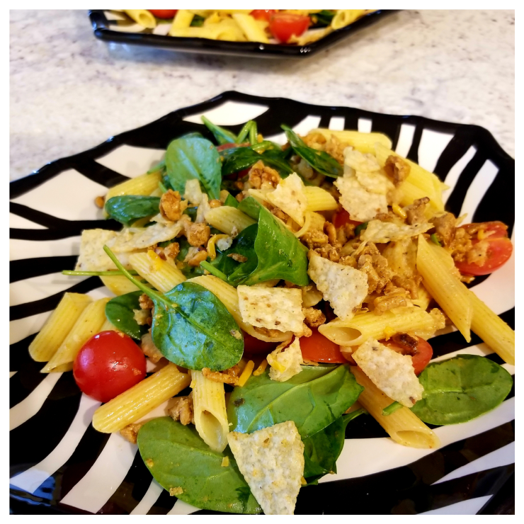 - After the pasta and chicken are prepared, combine all remaining ingredients except the tortilla chips in your large mixing bowl. Once you are ready to serve, you can either eat the chips as a side or crunch them up and stir into each individual serving (my personal preference!). If you go this route, just be sure to serve immediately so the chips don’t become soggy.