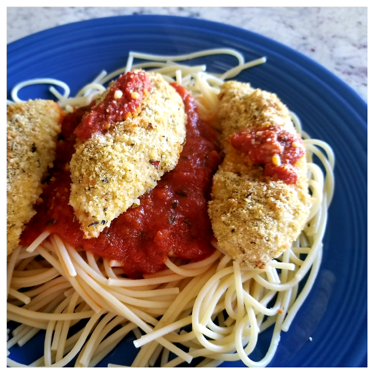 - Divide the spaghetti on each plate, then cover evenly with sauce and place the chicken tenders in the center of each spaghetti pile. For an extra bit of color, sprinkle with a little parsley before serving.